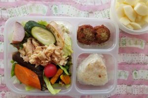 このお弁当。食べるときには,デザートのヨーグルトを取り出して,くずきりボールをスープに入れた状態でレンチンする予定。