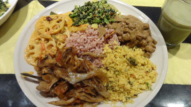 生のカレーリーフで作った青汁と,赤米のお粥を合わせて,ココナッツなどで味付けしたもので,これが意外な美味しさでした。