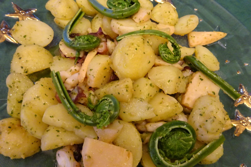 たけのことじゃがいもの炒めもの。こごみが可愛い。