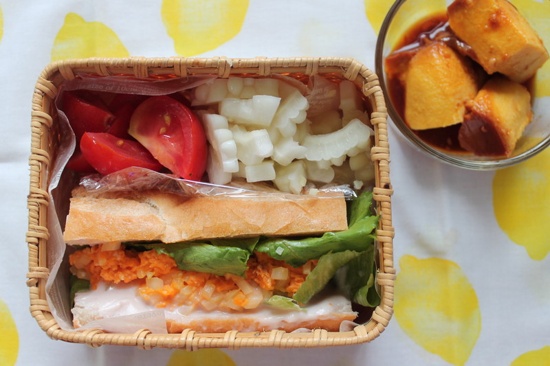 そろそろ食べきらないと、と思って、バケットにたくさんハムペーストを塗り、オムレツも挟んでサンドイッチに。