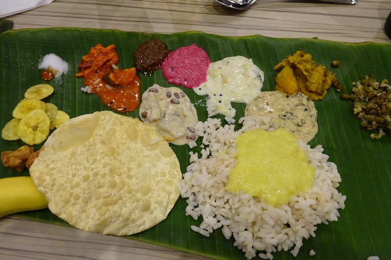 バナナの葉っぱの上に,マッタライスというケララのお米のほか,各種カレーやチャツネが並びます。
