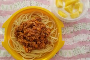 と言っても,冷凍してあったパスタソースを使った超かんたん弁当です。