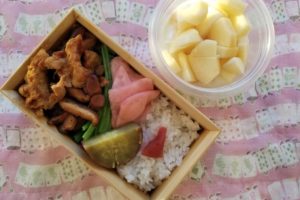 右上に入れてある酢鶏はファミレスのテイクアウトなので,自分で作ったのは,鮭おにぎりとさつまいもの甘煮だけ(^^;)