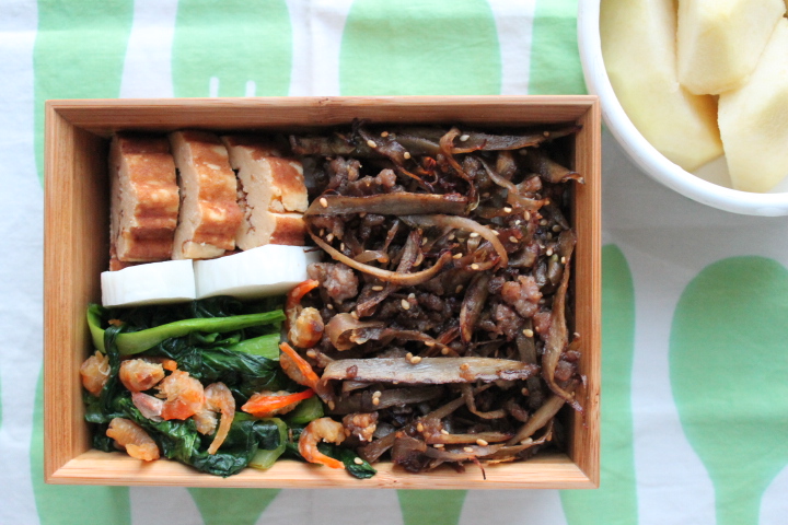 ごぼう炒めのほか,今年も定番の干し海老を入れた青菜のナンプラー炒め。