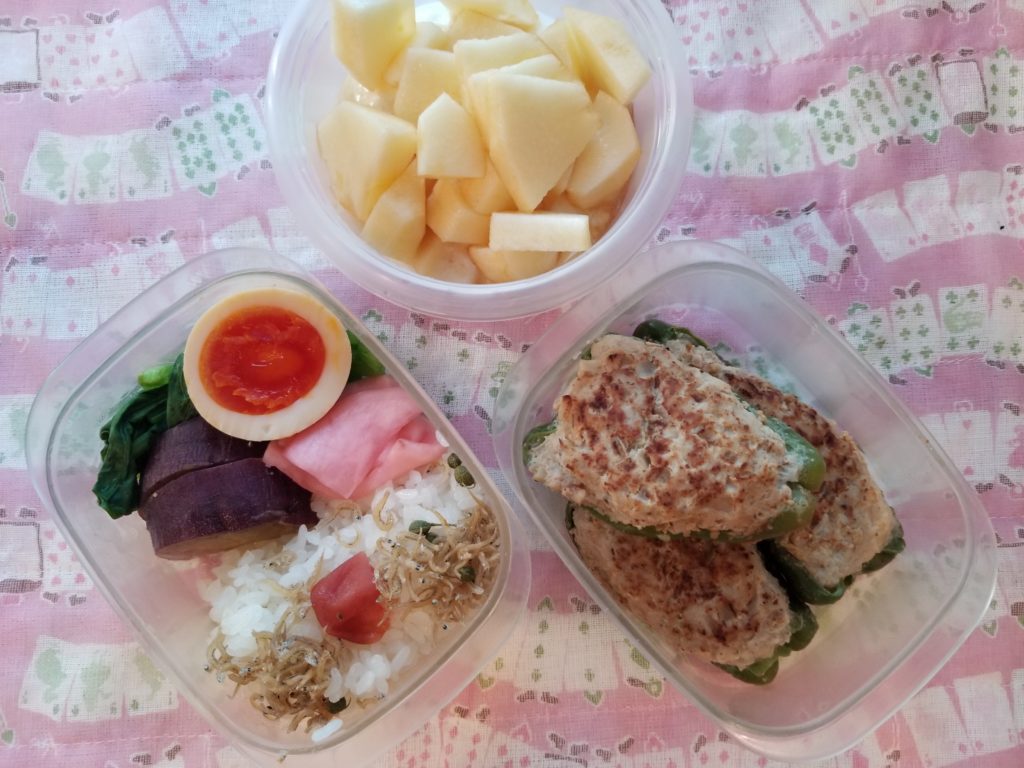 近所の惣菜屋さんのお総菜をだんなさんが買っておいてくれたので、お弁当に。