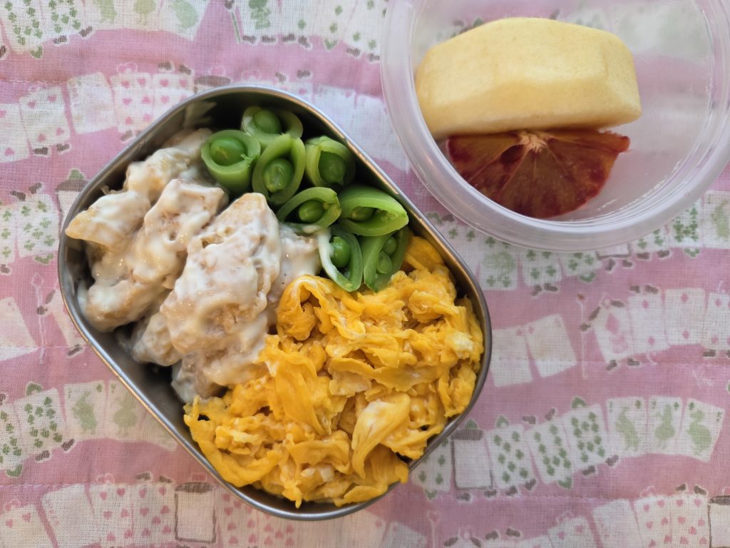 あとは、スナップえんどうといりたまごで簡単お弁当。