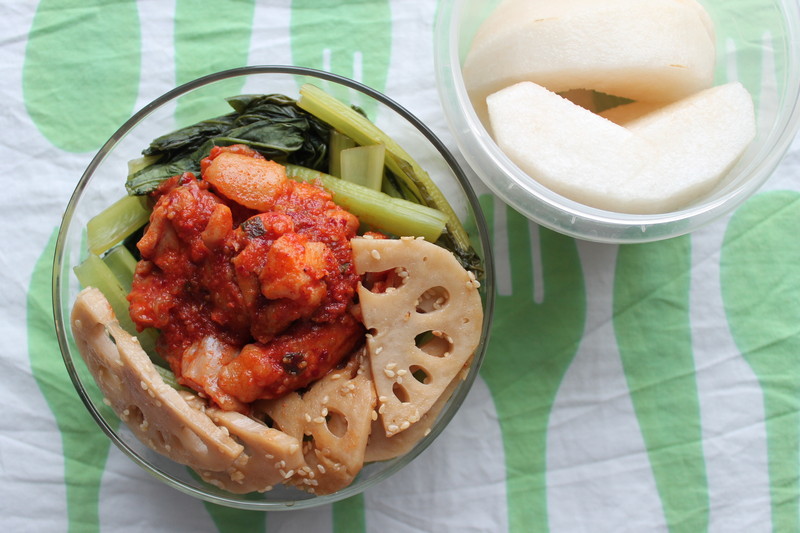 ごはんの上に,小松菜の黒酢蒸しを載せて,炒め直したダッカルビを載せ,ついでに,れんこんのきんぴらも。