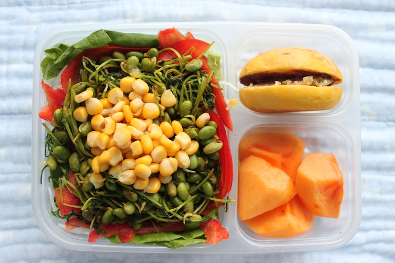 今日のお弁当は,ここのところ気に入っている豆苗と発芽大豆のサブジ。