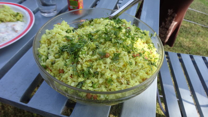 ポハという押し米の炒り蒸し。ライタやカレーとまぜて食べましたが,かなり美味。カレーリーフなども入っていて,南インド仕様でした。
