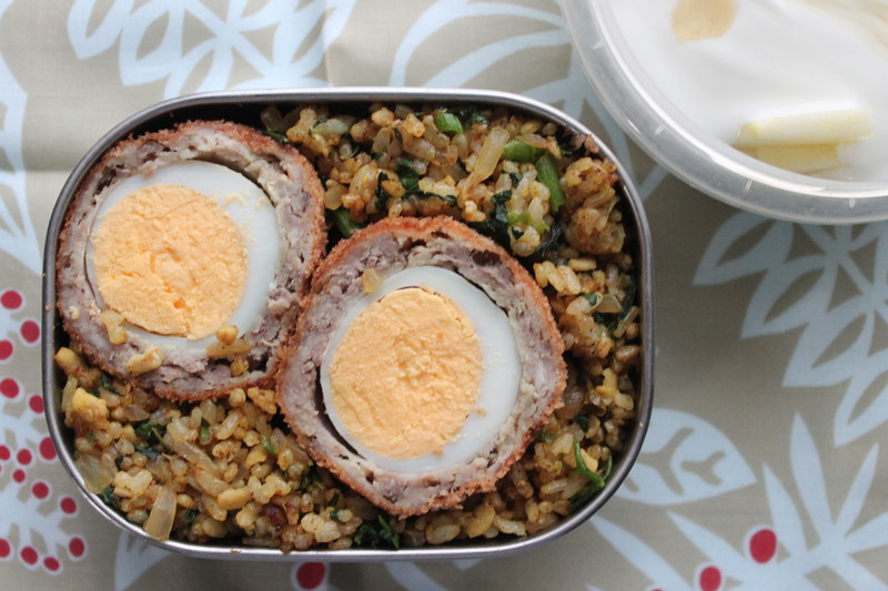 今日のお弁当は,ドライカレーにスコッチエッグを埋め込んだ(?)ものです。