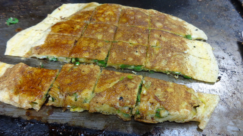 小麦粉を水に溶かして,たまごを入れたものをうすくテッパンに広げ,そこに大量のねぎ,天かすを載せ,さらに,たまご1個を溶いたものを上からかけていました。